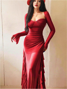 赤い長袖メッシュワンピース レディース ミディアム丈 ヒップカバー スカート 不規則なフリル スリット入りスカート おしゃれで上品