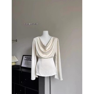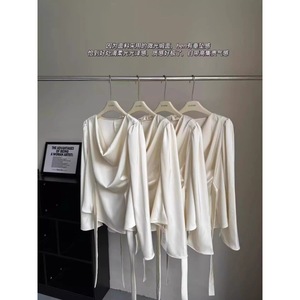 Qingyu シャンパンスイングカラーレースアップサテン長袖シャツ女性のための春の新しいスタイルセレブデザイン気質トップトレンディ