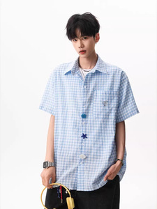 美式街头趣味纽扣短袖衬衫男女夏季多巴胺格子衬衣休闲情侣外套潮