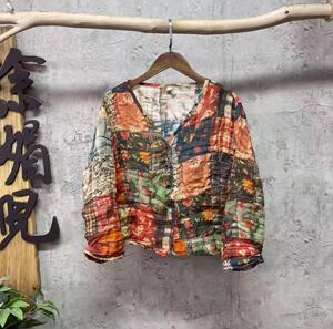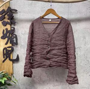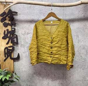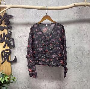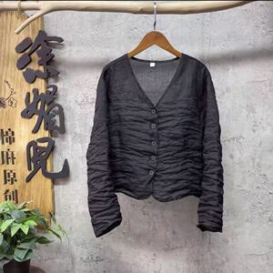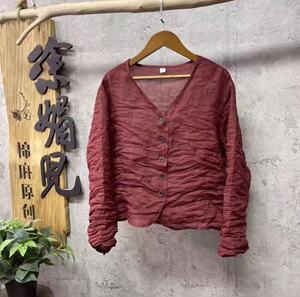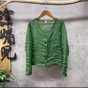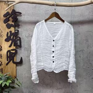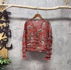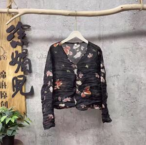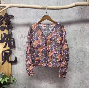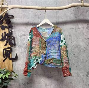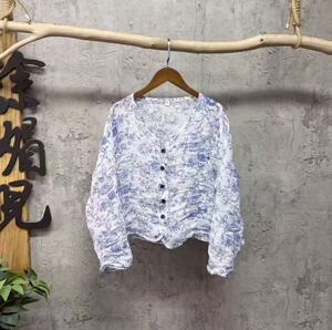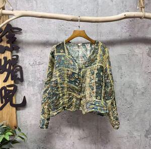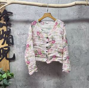 2025夏韩版宽松文艺减龄苎麻印花V领长袖防晒衬衫开衫百搭上衣女