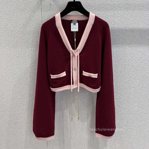 コントラストカラーバンジーレースアップニットショートカーディガンレディーススイートフレグランスファッション万能Vネックトップス秋ZW62367