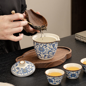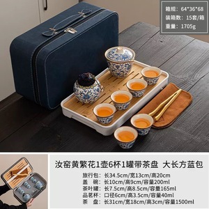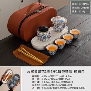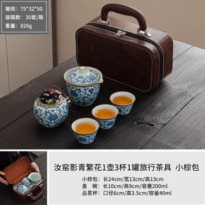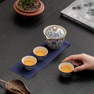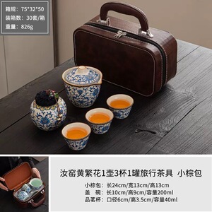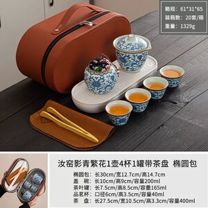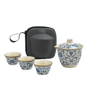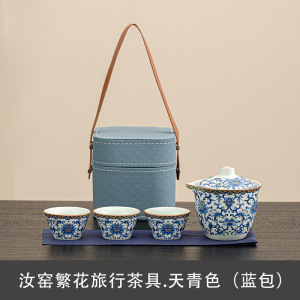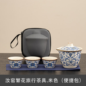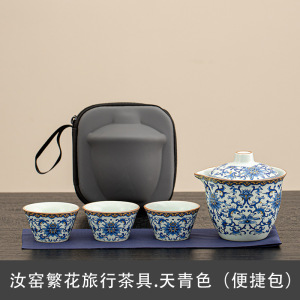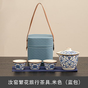 蓮柄ベージュ汝窯蓋ボウル旅行ティーセット小型セット 1 ポット 3 カップ屋外ポータブル青と白のクイックカップ