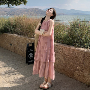 大码胖mm夏季法式复古温柔风假两件百褶无袖背心连衣裙女气质长裙