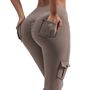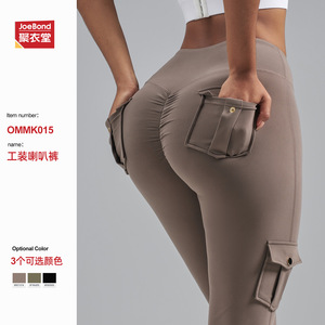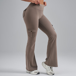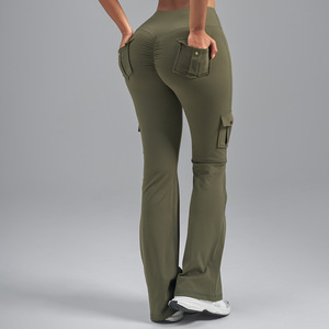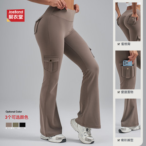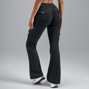 跨境单面磨毛工装喇叭裤透气高腰提臀口袋运动裸感显瘦健身瑜伽裤