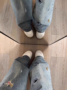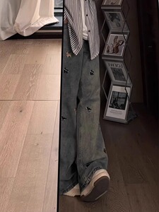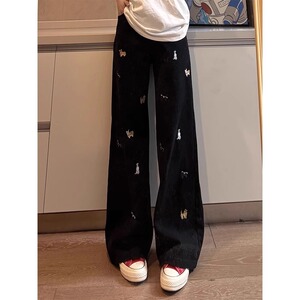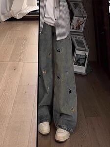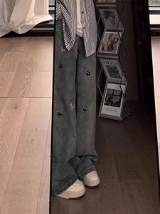 美式复古刺绣小狗牛仔裤男夏季潮牌水洗做旧微喇裤高街vibe直筒裤