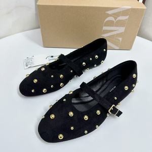 ZA2025新品女鞋棕色铆钉饰小香风芭蕾风平底休鞋平跟玛丽珍单鞋