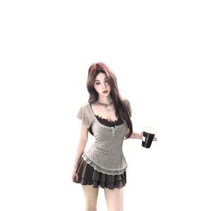 フレンチスタイルの本物のツーピースピュアレーススカートスーツ女性の夏のウエスト痩身半袖デザインフレンチ半袖ブラウスピュア