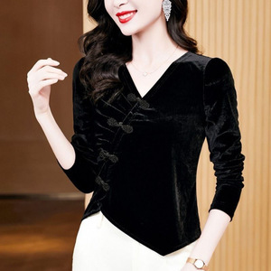 V领金丝绒上衣女秋装新款复古中国风盘扣小衫高端洋气黑色打底衫