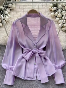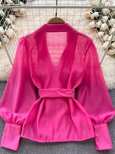 ヨーロッパとアメリカのクロスボーダー婦人服 2025 夏の新しい気質ソリッドカラーラペルシースルーウエストレースアップ長袖シャツトップ