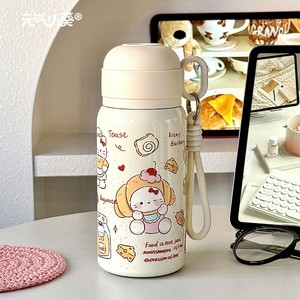 小碗盖三饮保温杯/白色【500ML】-面包小猫+提绳