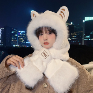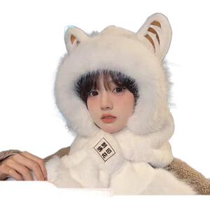 小老虎耳朵帽子围巾一体帽女冬季韩版可爱毛绒保暖护耳围脖雷锋帽