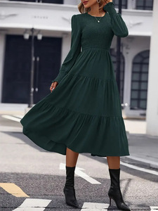 25欧美跨境外贸女装荷叶袖口优雅连衣裙纯色圆领大裙摆气质中长裙