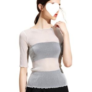 春夏新作透明日焼け止めメッシュ/ナイロンボトムシャツラウンドネックガーゼ、スプライシング、レースチュール半袖シャツ