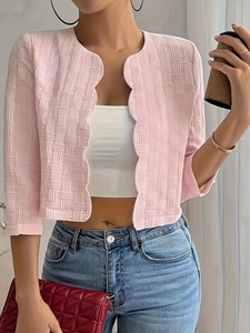 欧美跨境女士休闲时尚复古风格纯色前开七分袖春秋短款夹克外套上