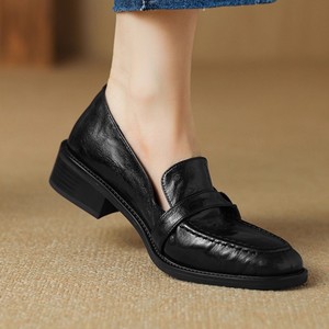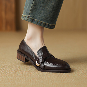 真皮中跟乐福鞋女2025春秋新款软底单鞋英伦风复古百搭棕色小皮鞋