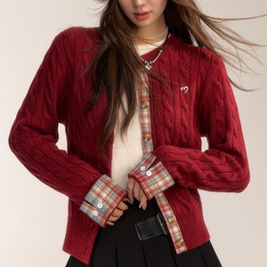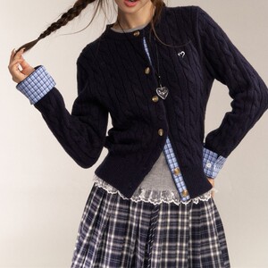 显瘦刺绣格纹优质毛衣女拼接复古毛衣学院风同款百搭韩系针织开衫