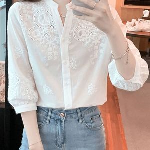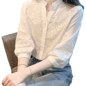 2025秋季新款衬衫绣花镂空七分袖V领衬衣洋气减龄女式通勤小衫