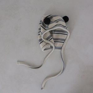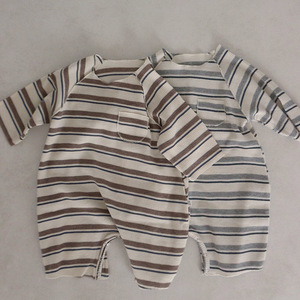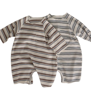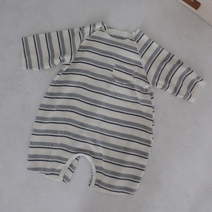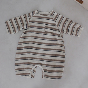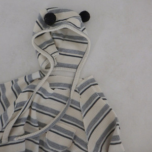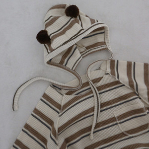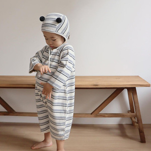 秋款童装小童条纹华夫格连体衣新生儿棉质长款爬服包屁衣哈衣帽子