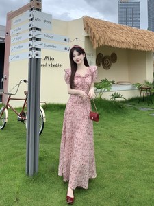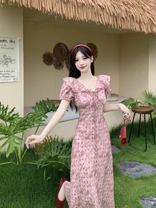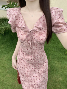 2025年夏フレンチスタイルウエスト痩身タイダイピンク水玉ミドル丈優しいフリルドレス