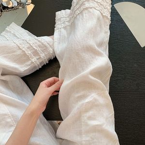 リラックスした耳付きストレートコットンとリネンの女性用カジュアルパンツ、夏の新しいスタイル、怠惰で多用途な白い9点ワイドレッグパンツ