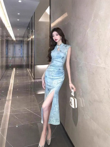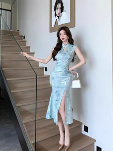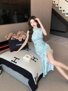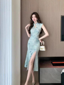 中国風のチャイナドレスレトロ改良された中国風のプリントドレス新しいエレガントなスリムフィットスリットサマードレス