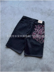 クロスボーダーヨーロッパとアメリカのトレンディなブランド桜プリントクォーターデニムショートパンツメンズハイストリートデザインルーズで多用途なロングパンツ