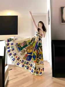 哥家商场同款女装2025夏季小众涂鸦印花复古民族风吊带连衣裙