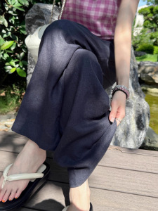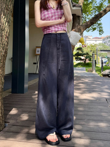 藏青色天丝亚麻阔腿裤女2025夏季薄款高端抗皱垂感透气直筒拖地裤
