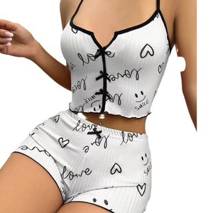 2025亚马逊速卖通 心形印花撞色居家服 前襟开叉吊带睡衣套装新品