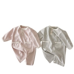 春秋款a类新生衣服婴儿软糯细条纹口袋连体衣宝宝长款包屁衣帽子