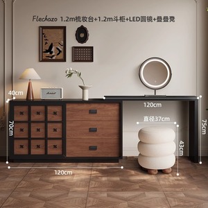 梦鹿K1中古梳妆台斗柜一体卧室复古胡桃木纹化妆桌高级床尾化妆柜