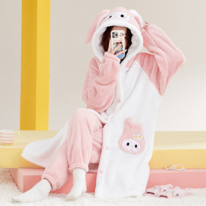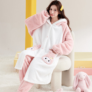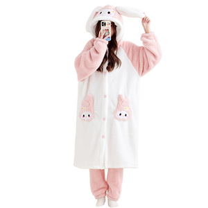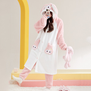 女性用の加工されたカスタムパジャマ、かわいいベルベットの厚みのあるゆったりとした刺繍入りウサギの耳フランネルロングナイトガウンセット
