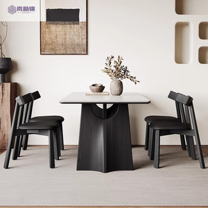 中古风飞鸦黑色实木餐桌简约设计师款长方形哑光白德利丰岩板餐桌
