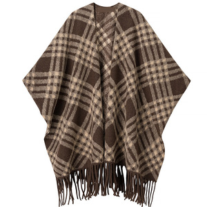 欧美秋冬条纹格纹流苏斗篷披肩女跨境热卖外搭围巾开衫针织披肩