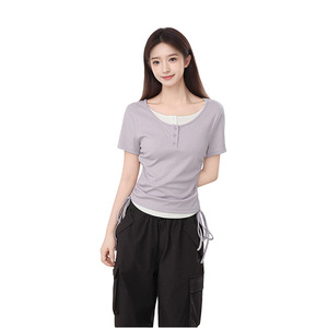紫色假两件正肩短袖t恤女夏夏季2025新款抽绳修身短款上衣