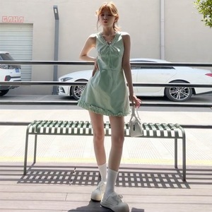 女性のための小さなフレンチグリーンノースリーブVネックドレス2025年夏の新しいホットスタイルのユニークで美しいショートスカート