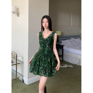 ガーリーなダークグリーンのシフォン耳バブルスカートドレス