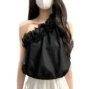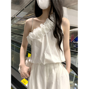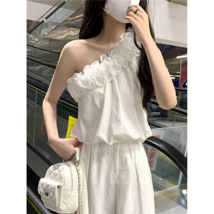 Thirteen Lines 2025 夏スラッシュネックオフショルダーフリルルーズ薄い花のつぼみノースリーブ不規則なベストトップ女性用