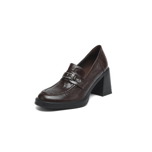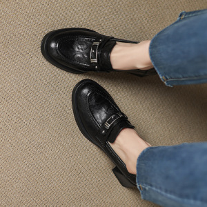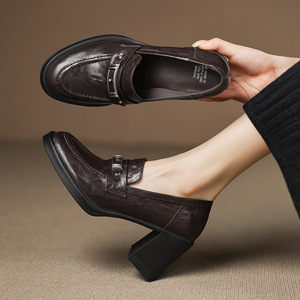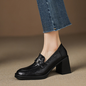 おしゃれで通勤に便利なメタルバックル第一層牛革ローファー2025秋厚底ハイヒールラウンドトゥ本革深口靴
