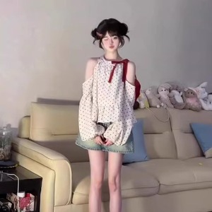 フランスの美しい蝶結び水玉シャツ女性の夏の新しい長袖シャツルーズ気質オフショルダートップ