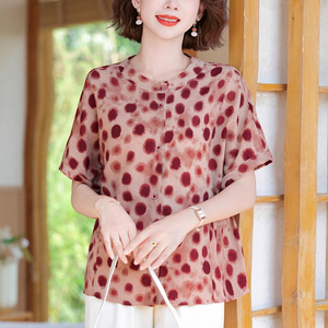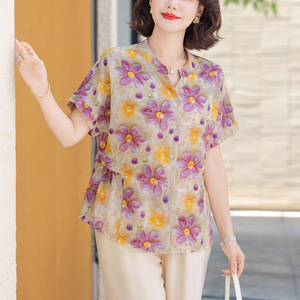 中高年向け夏用半袖Tシャツ、控えめでエレガントなゆったりトップス、ママの2025年夏新作婦人服、おしゃれなシャツ