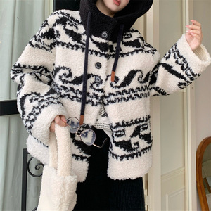 デザインヘビーデューティジャカードコントラストカラー秋と冬の新しい長袖ルーズフード付きジャケットニットカーディガンセーターレディーストップ