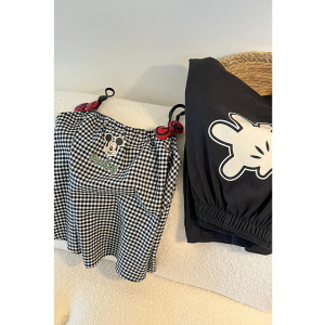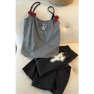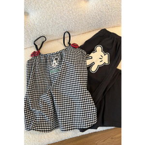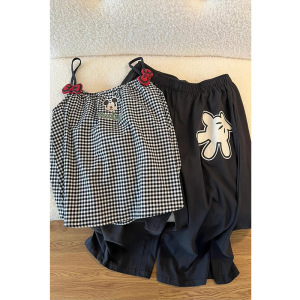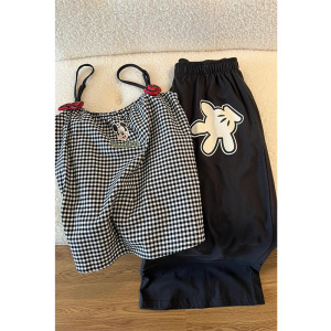 韓国版ミッキーチェック柄サスペンダーパジャマ女性のための夏 2025 新しい怠惰なルーズパンツホームウェアスーツアウターウェア
