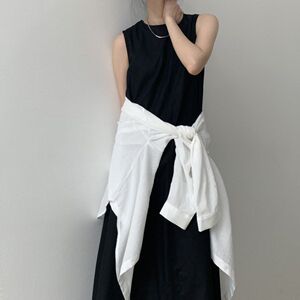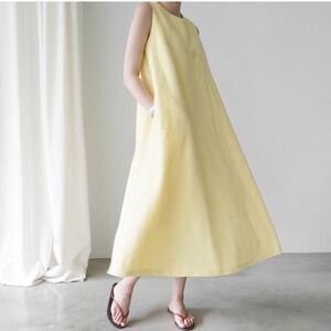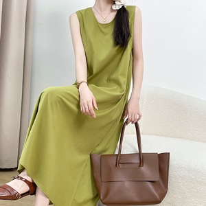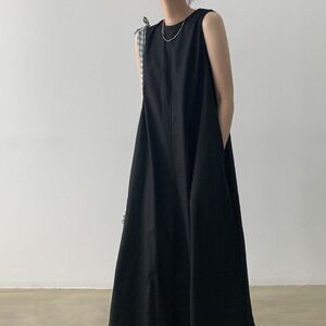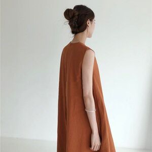 コットンとリネンのドレス カジュアル 膝上 ゆったり 韓国風 ロング 大きな裾 ラウンドネック ノースリーブ 無地 ブラウンレッド オフホワイト イエロー