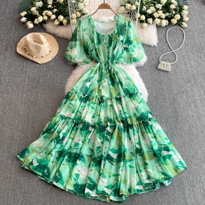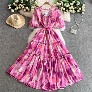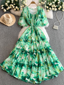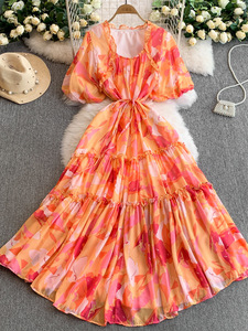 法式复古温柔粉色印花方领泡泡袖连衣裙女夏季收腰木耳边蛋糕长裙