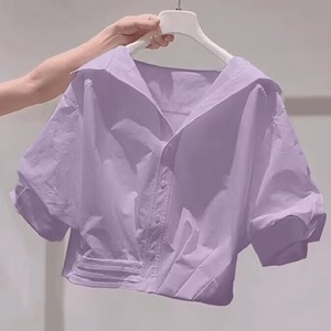 巨好看树莓粉翻领泡泡袖衬衫女夏季爆款ins风宽松多巴胺短款衬衣