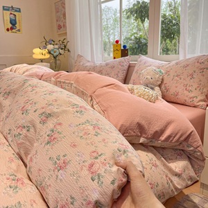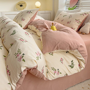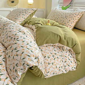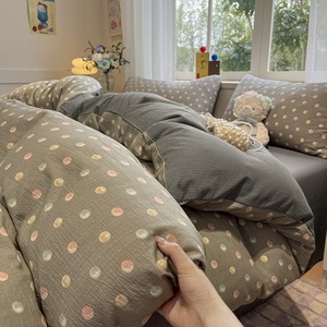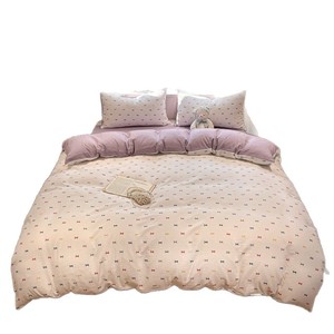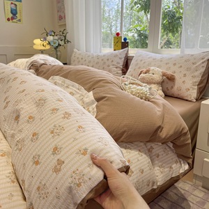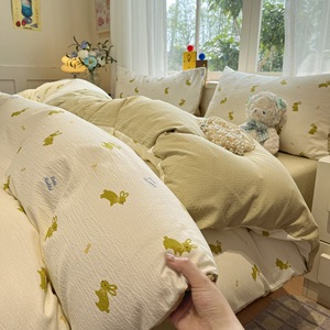 小さな新鮮な二層糸洗い綿ベッド 4 点セット、裸で寝られるシーツ、掛け布団カバー、ボックスシーツ、学生寮 3 点セット