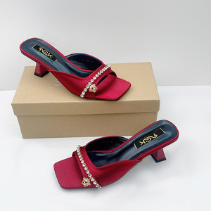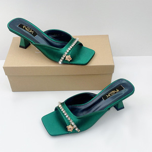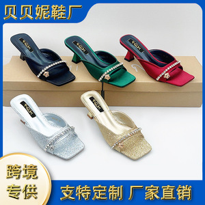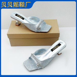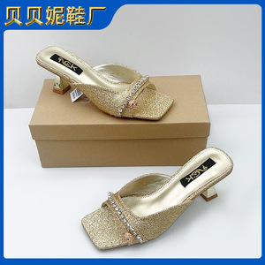 スクエアトゥ太いヒールラインストーンストラップサンダル女性のための秋の新しいファッション多用途スリッパヨーロッパとアメリカのハイヒールサンダル