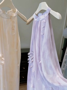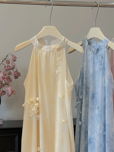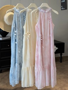 フレンチタイダイ立体フラワーホルターネックオフショルダードレス女性のための 2025 夏ルーズスーパーフェアリーリゾートスタイルロングスカート