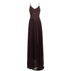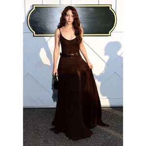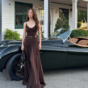 现货女神V领麂皮吊带裙法式复古腰带收腰显瘦拖地晚礼服连衣裙长